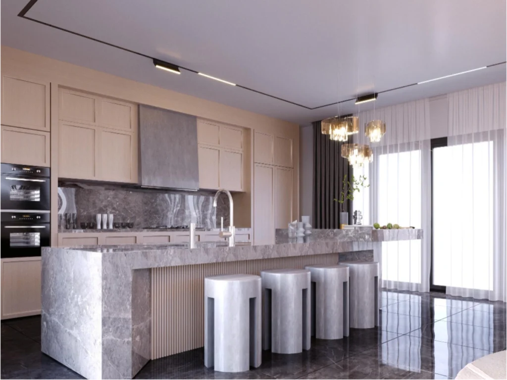The countertop is not just a functional surface; it’s a statement piece in premium kitchen design. Materials like quartz or marble not only offer durability but also add an element of sophistication. When choosing your materials, consider their maintenance requirements and how they align with your lifestyle. Quartz, for instance, is non-porous making it a great option for busy kitchens.